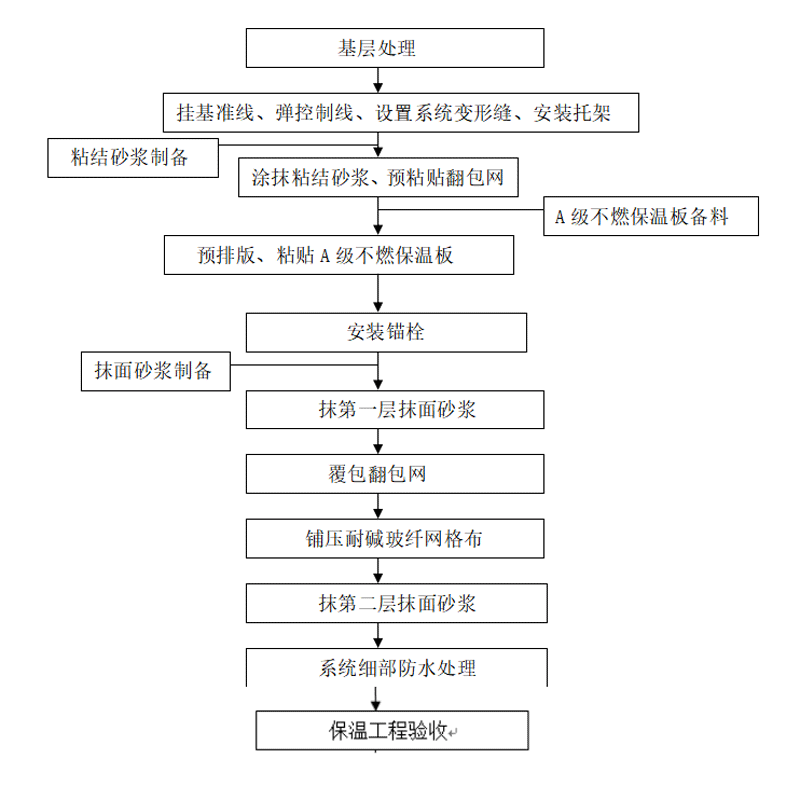 涂料飾面勻質板防火保溫板外墻外保溫系統施工流程見下圖: